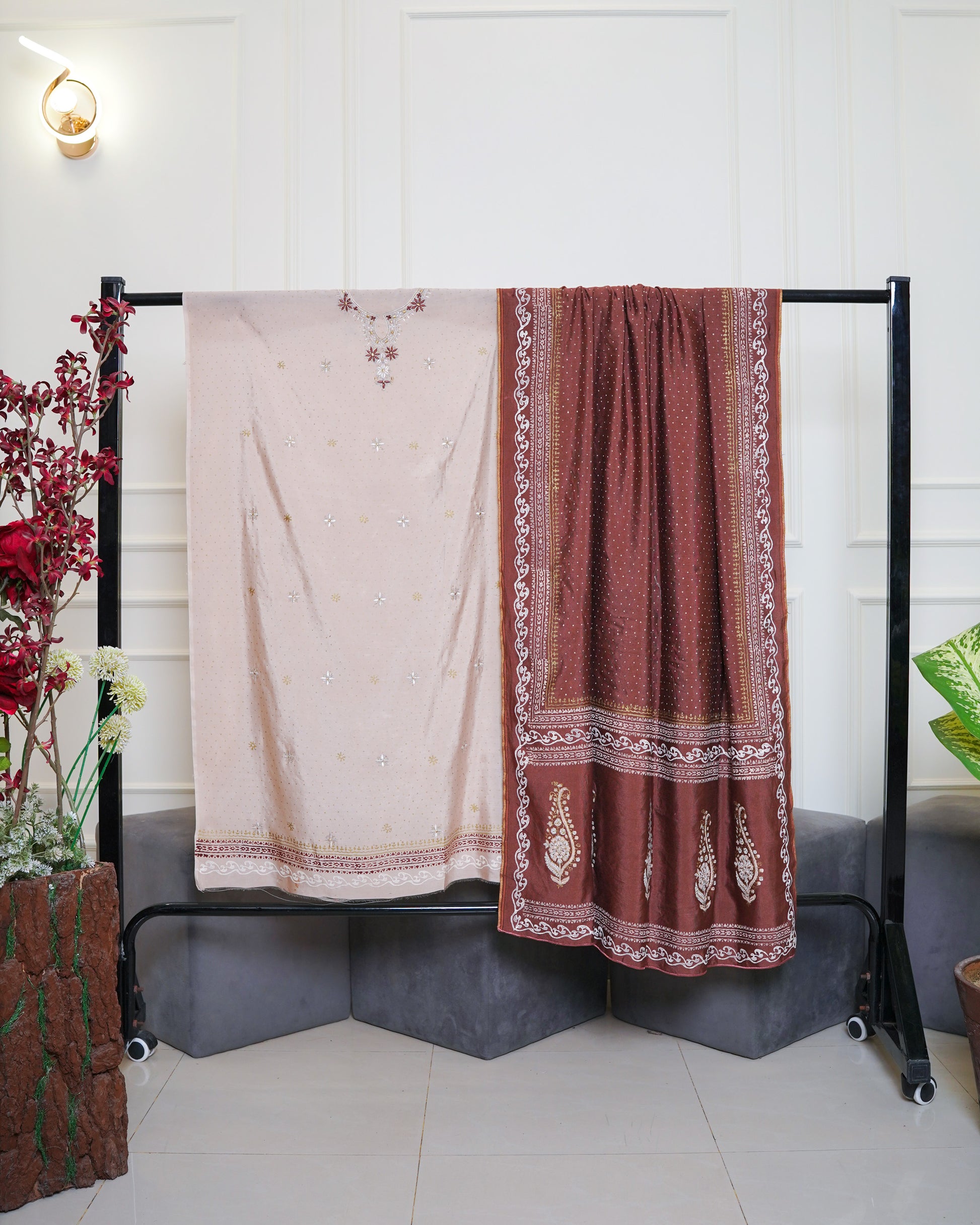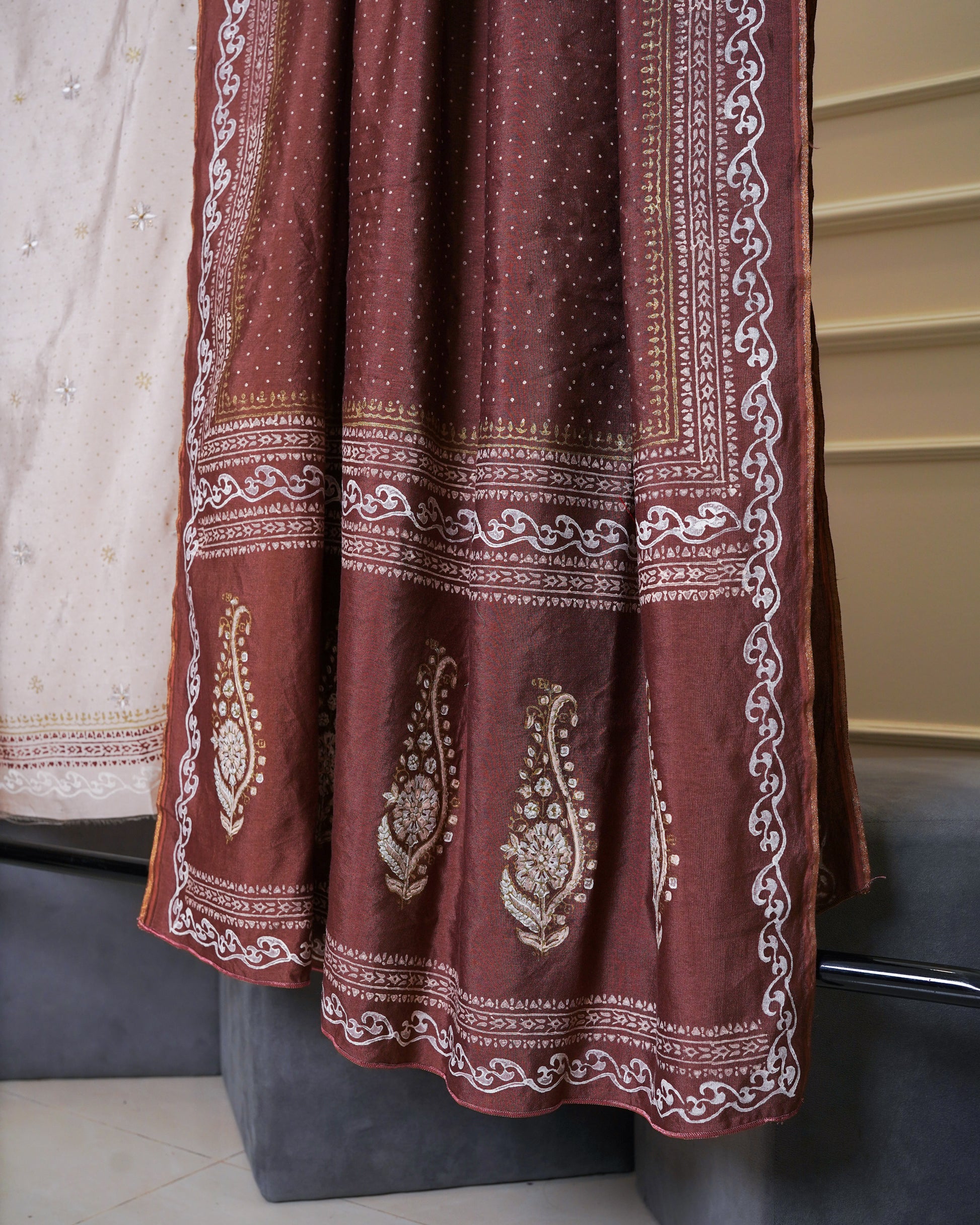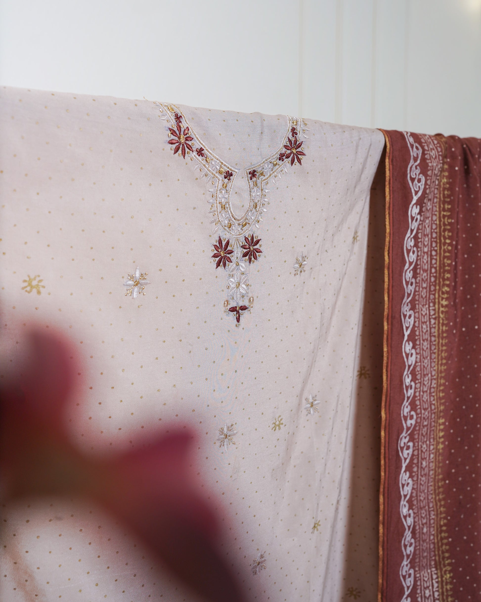 A classic beige shirt with delicate embroidery on neckline and shirt, paired with a brown block print dupatta, blending earthy warmth with understated sophistication.