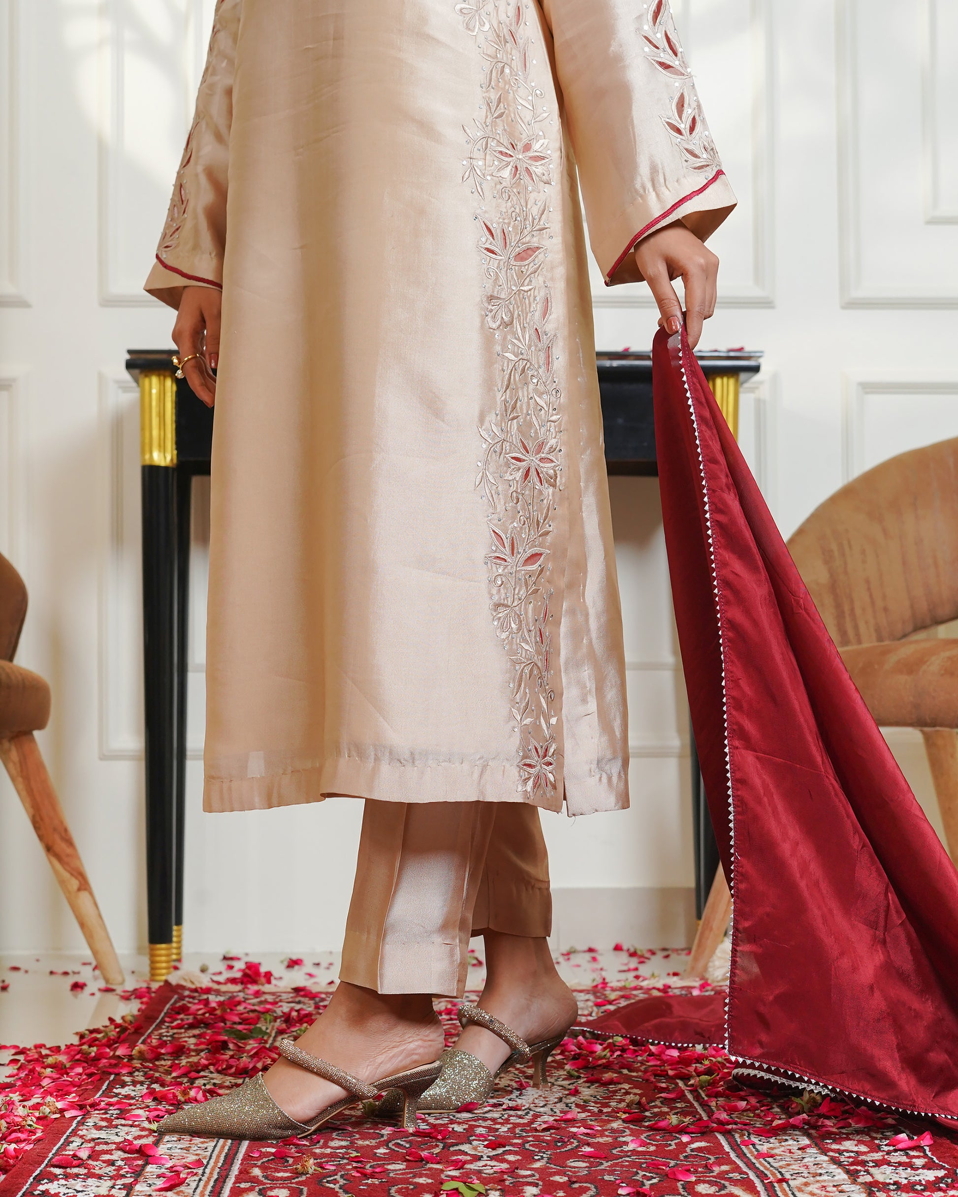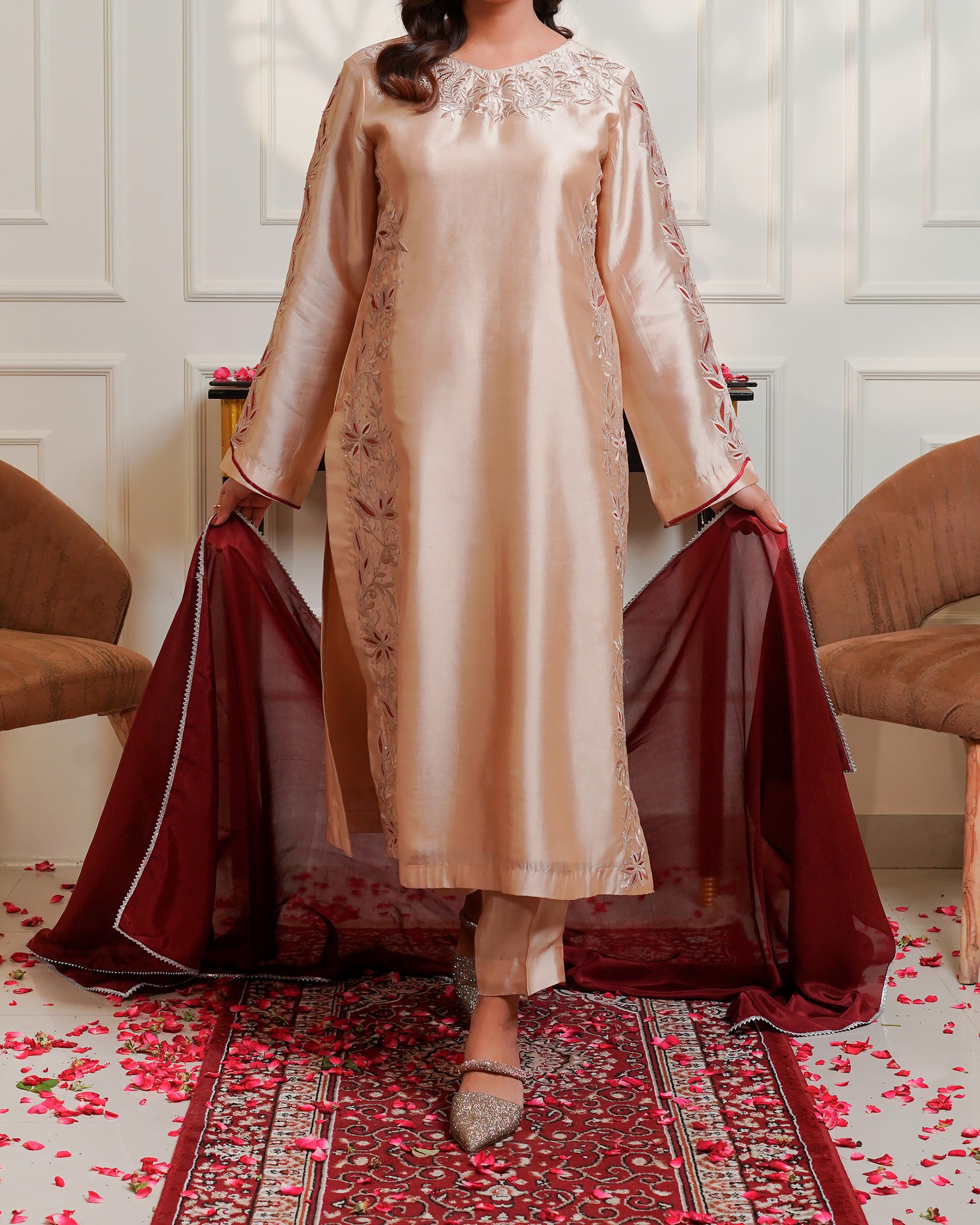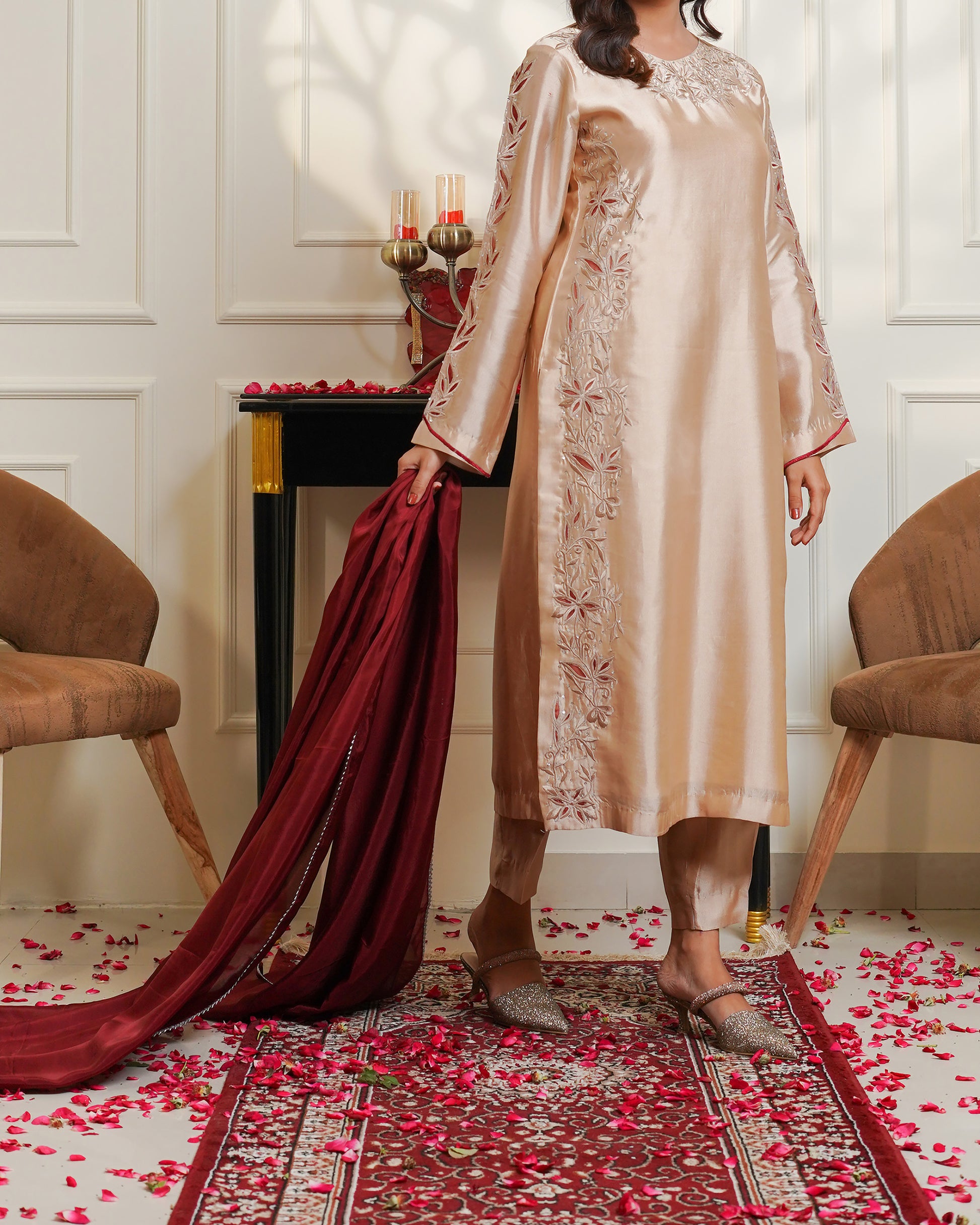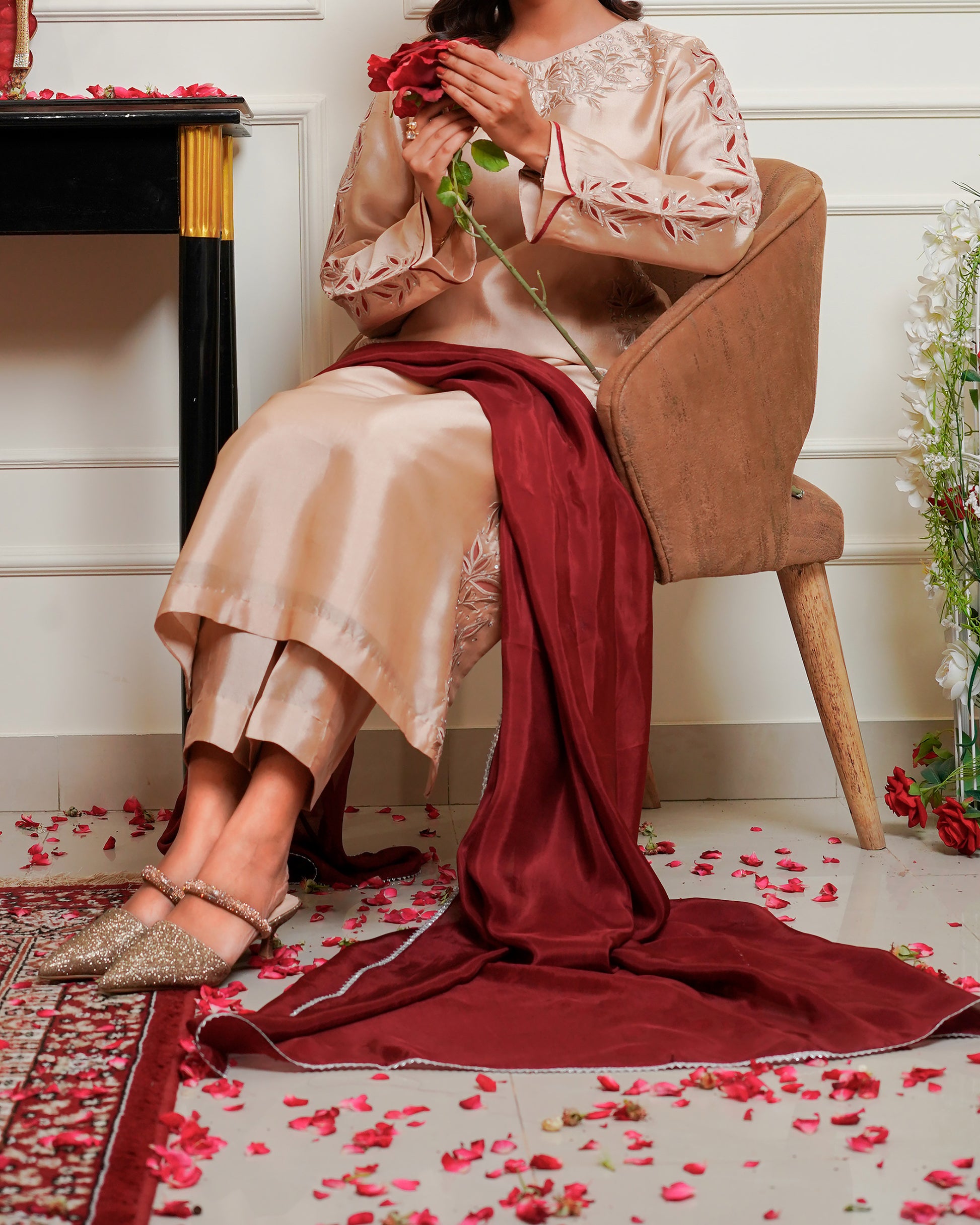 Beige and maroon elegance with delicate machine embroidery & sequins all over shirt, styled with a rich maroon silk dupatta for a look of refined sophistication.